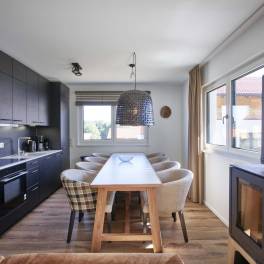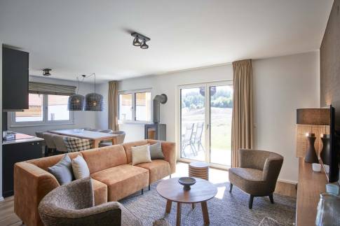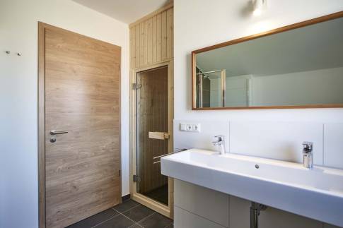Op de begane grond heeft Type Falkenstein een grote slaapkamer met ensuite badkamer met douche, een open woonkamer, een gastentoilet en een open hal die toegang geeft tot de bovenverdieping. Hier vind je een grote badkamer met douche en bad, nog een kleine doucheruimte en een apart toilet. De bovenverdieping heeft ook drie slaapkamers, elk met twee bedden. Het terras en het overdekte balkon aan de gevelzijde bieden plaats aan maximaal acht personen.