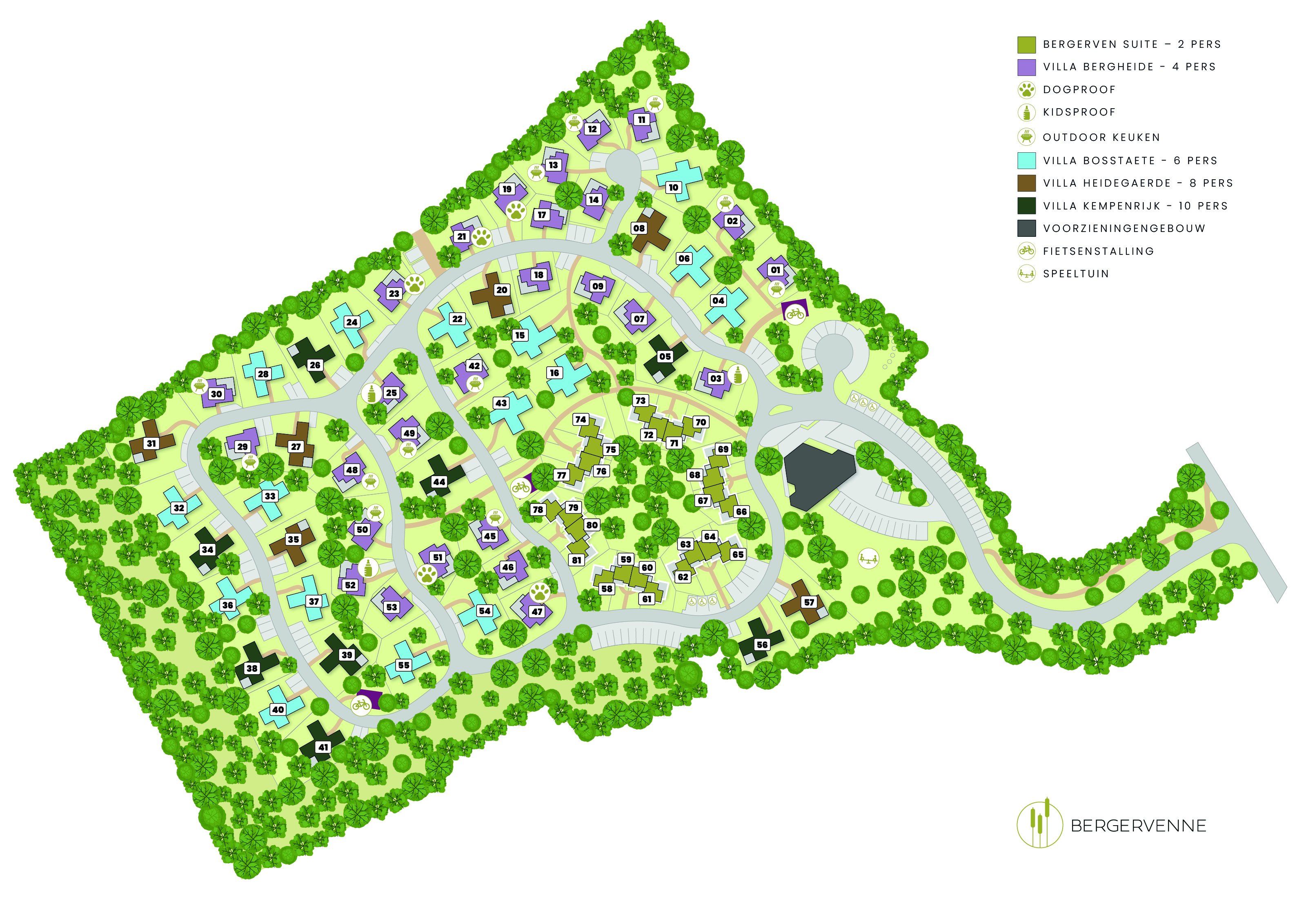 - Harmonieus ingepast in de natuurlijke hoogteverschillen met een korte loopafstand tot het centrale voorzieningengebouw