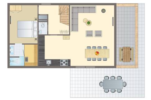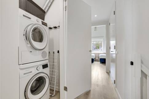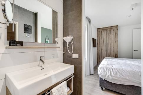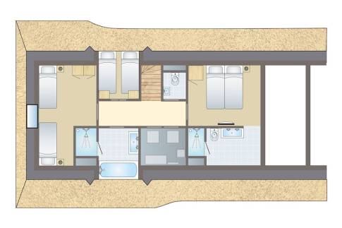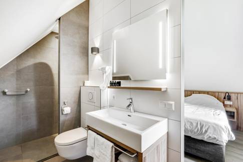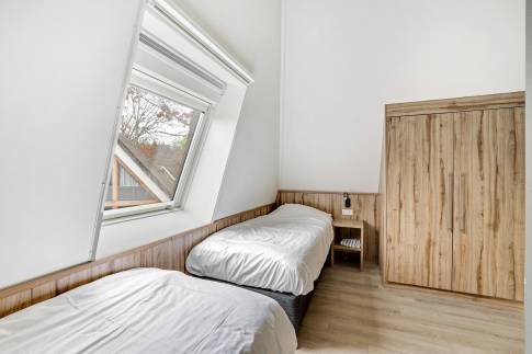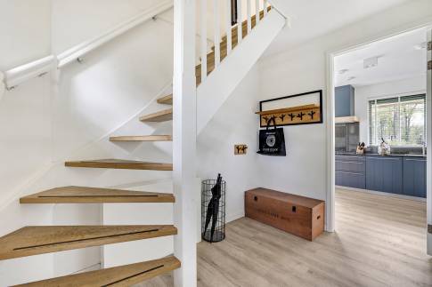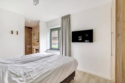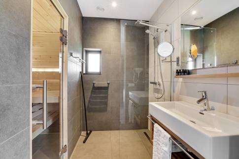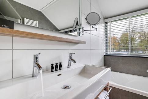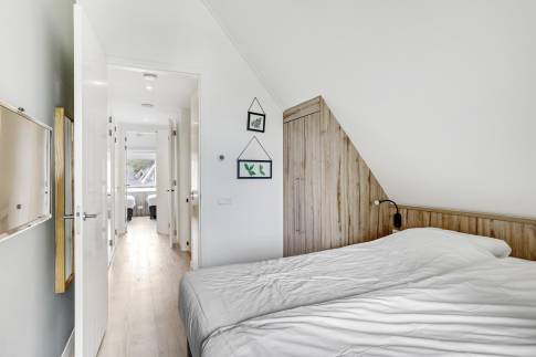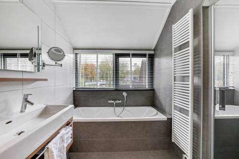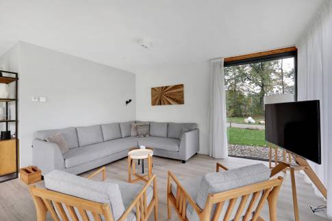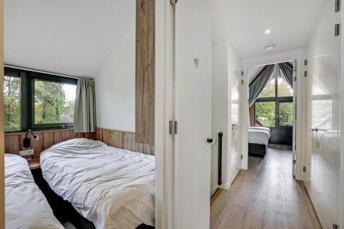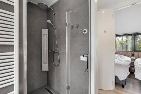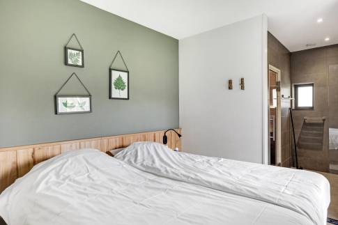 De luxe recreatiewoning beschikt over een lichte, ruime woonkamer voorzien van vloerverwarming. De luxe uitgeruste open woonkeuken is voorzien van alle moderne gemakken. Via een grote schuifpui heb je toegang tot een ruim, zonnig terras. De master bedroom met televisie bevindt zich op de begane grond. Deze heeft tevens een ensuite badkamer voorzien van regendouche en wastafel. Bij de badkamer vind je ook de sauna en er is beneden een separaat toilet. Op de verdieping bevinden zich nog eens twee slaapkamers en een bedstee met elk twee eenpersoons boxspringbedden. De twee badkamers zijn respectievelijk voorzien van een bad, inloopdouche met sunshower en dubbele wastafel, of inloopdouche en dubbele wastafel. Daarnaast is er boven nog een apart toilet.