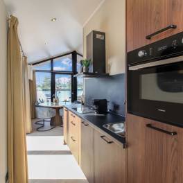 De badkamer is uitgerust met een toilet, wastafel en een inloopdouche. De open keuken is volledig voorzien van moderne inbouwapparatuur, waardoor het bereiden van heerlijke maaltijden een plezier wordt. Of je nu een snel ontbijt bereidt voordat je op avontuur gaat of een uitgebreid diner klaarmaakt, de keuken biedt alles wat je nodig hebt.