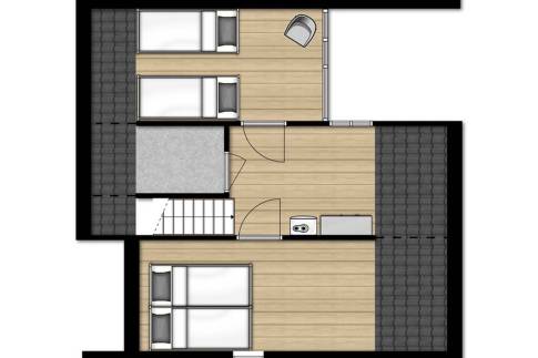 De woning telt twee slaapkamers op de eerste verdieping met elk twee eenpersoonsbedden, én een extra, compacte slaapkamer op de begane grond – ideaal voor gezinnen of gasten die liever beneden slapen. De badkamer met douche en toilet bevindt zich eveneens beneden.