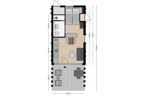 Het vrijstaande, gelijkvloerse Type Forest 2 is met een woonoppervlakte van 28 m² heel compact. Je kunt er met 2 personen goed verblijven. De compacte keuken heeft een 4-pits inductieplaat, vaatwasser, koelkast en oven. Niets houdt je tegen om vorstelijk te eten in het zachte licht onder de pergola. Door de slimme opbergvakken onder de bedden, benut je de ruimte optimaal. De badkamer heeft een regendouche, een wastafel en toilet. En de Wi-Fi is hier supersnel. Hoezo behelpen?