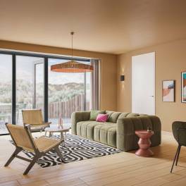 De Duyn Suite Comfort voor 4 personen, het perfecte toevluchtsoord voor een gezin. Deze gelijkvloerse woning biedt een warme en knusse sfeer, verborgen in het duinlandschap. Een elegante pergola verwelkomt je en biedt je beschutting voor het terras. Het verwelkomt je binnen in de gedeeltelijk ondergrondse suite.