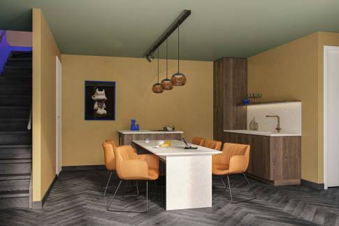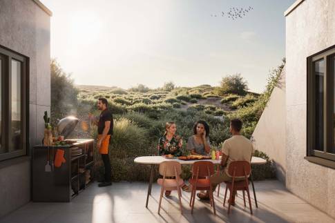 Op de souterrain opent zich een wereld van luxe en ruimte. Hier bevindt zich een royale open keuken met eetruimte, die via een grote glazen pui direct verbonden is met een beschut terras, omsloten door drie zijden van de villa. Het duin zelf vormt de vierde gevel, waardoor een intieme patio ontstaat met een stijlvolle buitenkeuken . Perfect voor lange, ontspannen avonden.