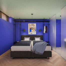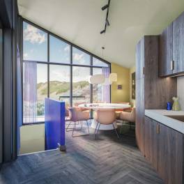 In het souterrain bevinden zich vier luxe tweepersoonsslaapkamers, waarvan twee met een eigen ensuite badkamer. Daarnaast is er een aparte badkamer met een ruime inloopdouche en een Finse sauna voor ultieme ontspanning. De villa is verdeeld over twee woonlagen, die elk een unieke ambiance bieden. Via twee trappen bereik je het woondeel, bestaande uit een royale woonkeuken en een lichte, sfeervolle woonkamer. Dankzij de grote glazen gevels en het indrukwekkende oplopende plafond baadt de ruimte in natuurlijk licht. De moderne keuken is voorzien van hoogwaardige apparatuur én een wijnkoeler.