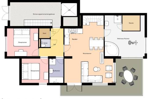 Zodra je binnenkomt in dit royale penthouse valt direct het licht en de ruimte op. De woonkamer is sfeervol ingericht en biedt dankzij de grote ramen een spectaculair uitzicht over de heuvels van de Eifel. De moderne open keuken is compleet uitgerust en vormt het gezellige hart van de woning. Op de begane grond bevinden zich twee slaapkamers, beide voorzien van 2-persoonsbedden. Daarnaast bevindt zich op deze verdieping ook een badkamer met een ligbad, inloopdouche en wastafel. Ook een separaat toilet voor extra gemak. Via de trap bereik je de bovenverdieping met nog één uitgebreide slaapkamer met nog een luxe badkamer met douche en toilet. Het penthouse is ook voorzien van een luxe wellness ruimte, met een sauna, whirlpool, inloopdouche, wastafel en sporttoestellen. Buiten geniet je vanaf het ruime balkon van de ochtendzon of van een avondborrel met panoramisch uitzicht. Dit penthouse combineert ruimte, privacy en luxe in een unieke setting.