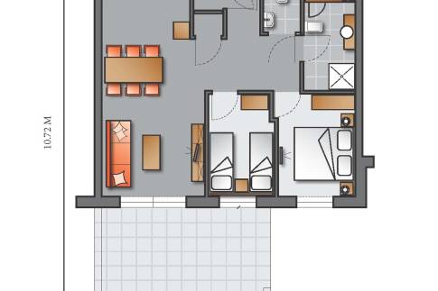 Wanneer je binnenstapt in appartement C2, ervaar je direct een gevoel van ruimte en comfort. De moderne woonkamer biedt een gezellige zithoek en een luxe open keuken, compleet ingericht voor een ontspannen verblijf. De grote ramen brengen het buitengevoel naar binnen. In de wellnessbadkamer kom je tot rust met een regendouche, infraroodsauna en dubbele wastafel. Daarnaast is er een separaat gastentoilet aanwezig. De twee slaapkamers zijn sfeervol ingericht met voldoende kastruimte. Vanaf het overdekte terras geniet je in alle seizoenen van het adembenemende uitzicht over de heuvels van het Sauerland.