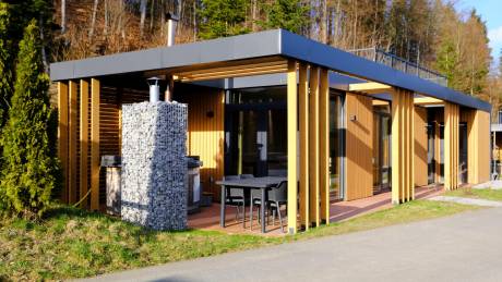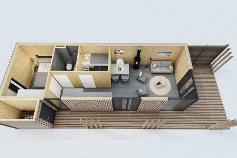 De woonkamer beschikt over een comfortabele zit- en eethoek, een slaapbank (voor twee personen) en is voorzien van een pelletkachel. De open keuken is uitgerust met een vaatwasser, inductiekookplaat, koelkast met vriesvak en heteluchtoven. Er is toegang tot een ruim terras met pergola en BBQ meubel. De ouderslaapkamer is uitgerust met een tweepersoonsbed en veel kastruimte. De tweede slaapkamer is voorzien van een stapelbed. In de badkamer vind je het toilet, een douche met Sunshower en een wastafel. Er is een uitpandige berging voor fietsen en/of skispullen.