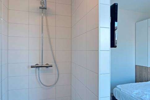 De open hal leidt naar een aparte toiletruimte, een praktische berging en twee comfortabele slaapkamers, elk met twee eenpersoonsbedden. Beide slaapkamers beschikken over een eigen en-suite badkamer, uitgerust met een inloopdouche en wastafel.