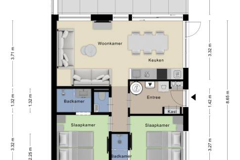 De woning beschikt verder over een open hal, separate toiletruimte, praktische inpandige berging en twee comfortabele slaapkamers, elk met een eigen badkamer en suite, voorzien van een inloopdouche en wastafel – ideaal voor optimaal comfort en privacy.