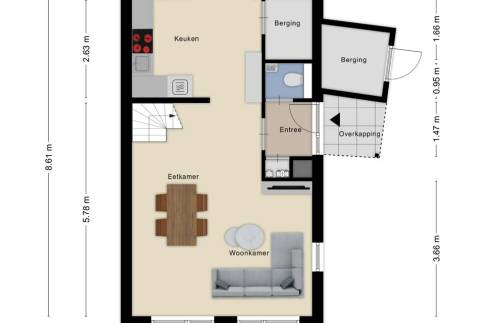 Je stapt binnen in een royale hal met toilet en loopt door naar de lichte, sfeervolle woonkamer. De open keuken grenst direct aan de openslaande deuren van het overdekte terras, waardoor je in de zomer heerlijk buiten kunt tafelen én in contact blijft met je gezelschap terwijl je kookt in de volledig uitgeruste, moderne keuken. Deze open indeling zorgt voor een prettige, ruime en lichte sfeer. Daarnaast beschikt de woning over een praktische berging, een separaat toilet op de begane grond en is er ruimte om één auto direct bij de woning te parkeren.